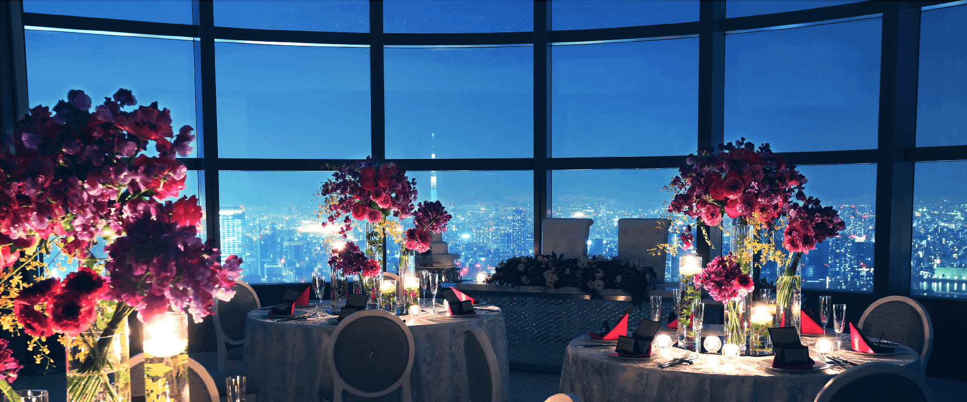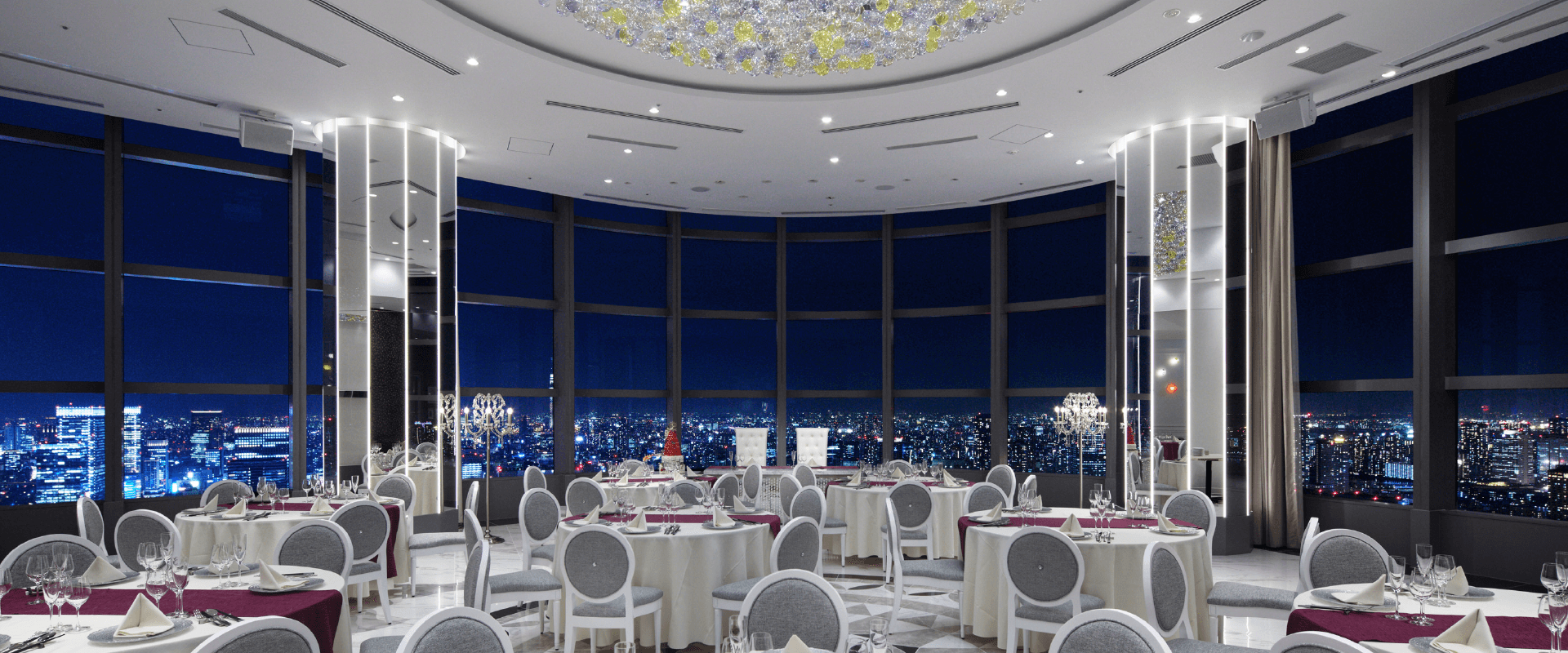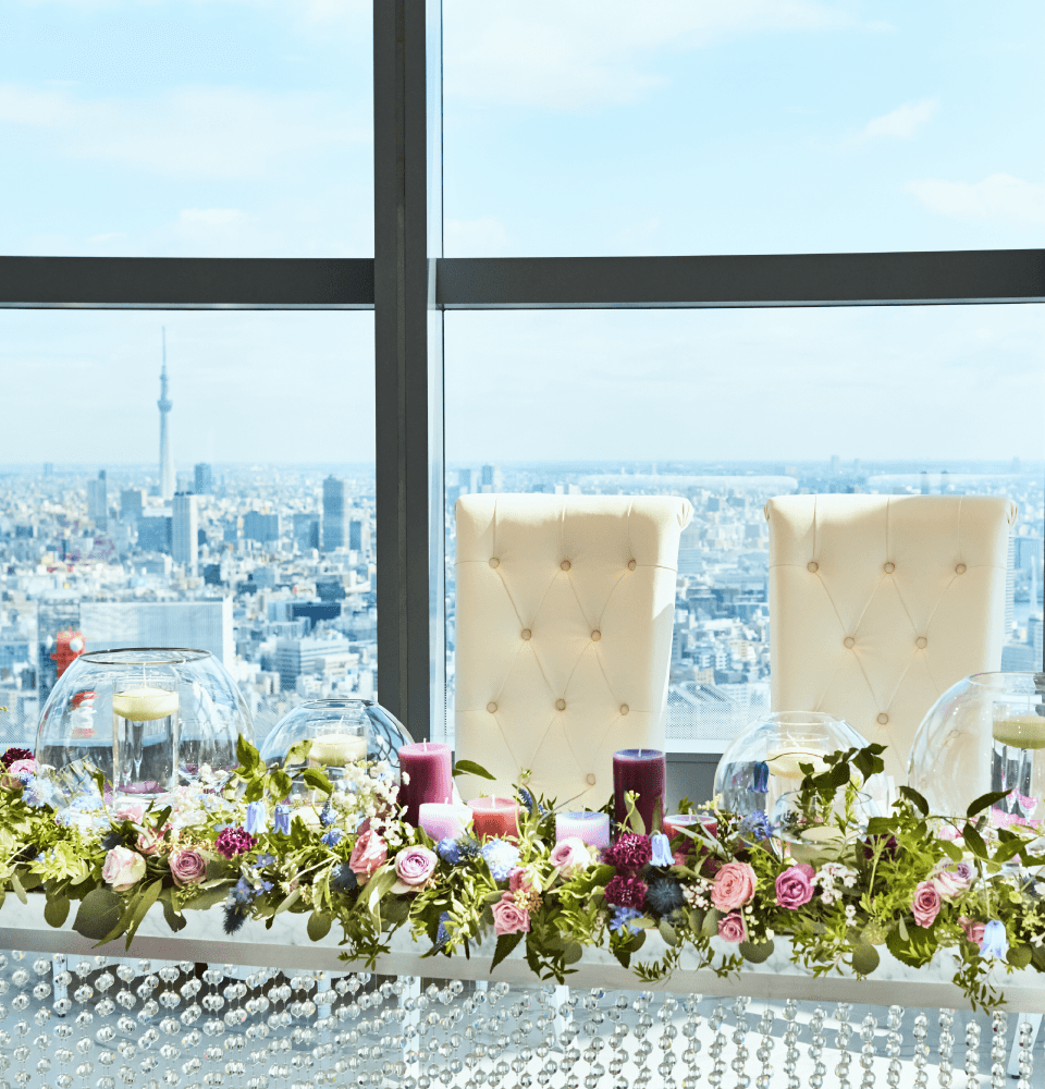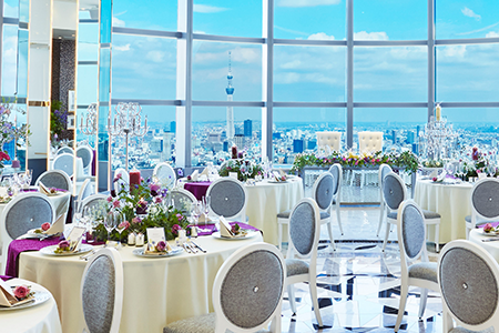 空間を演出するためのアクセサリー大きな窓に囲われた披露宴会場の