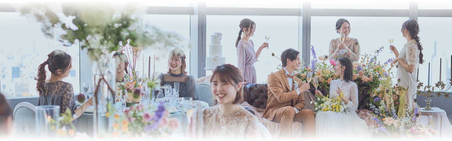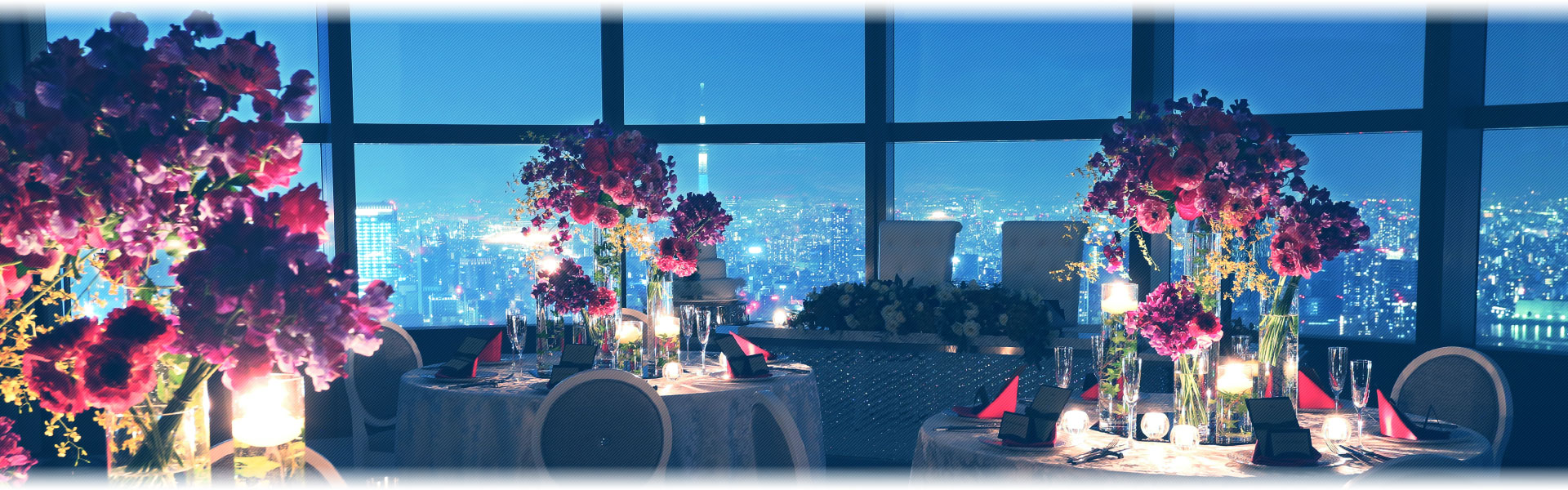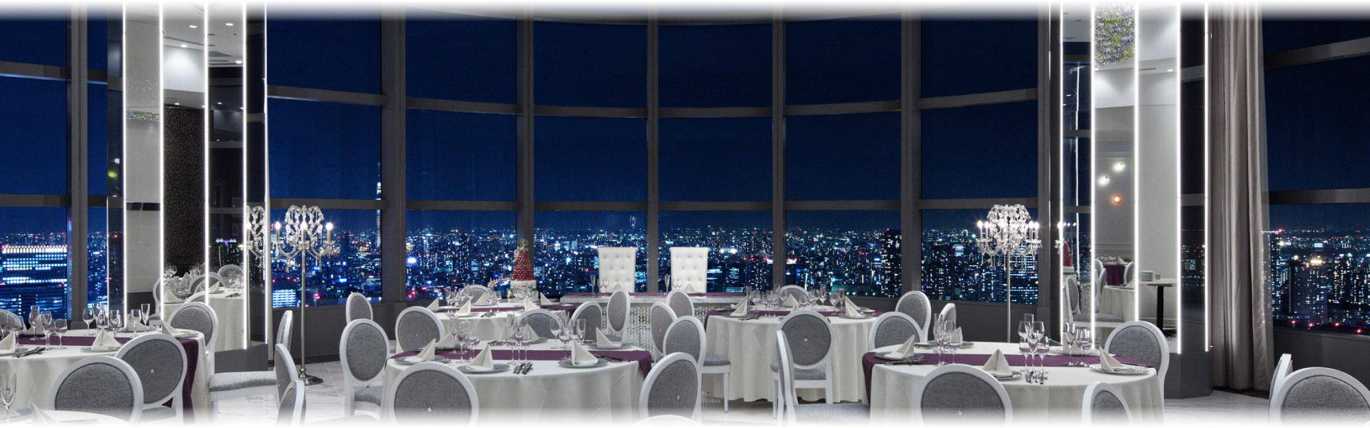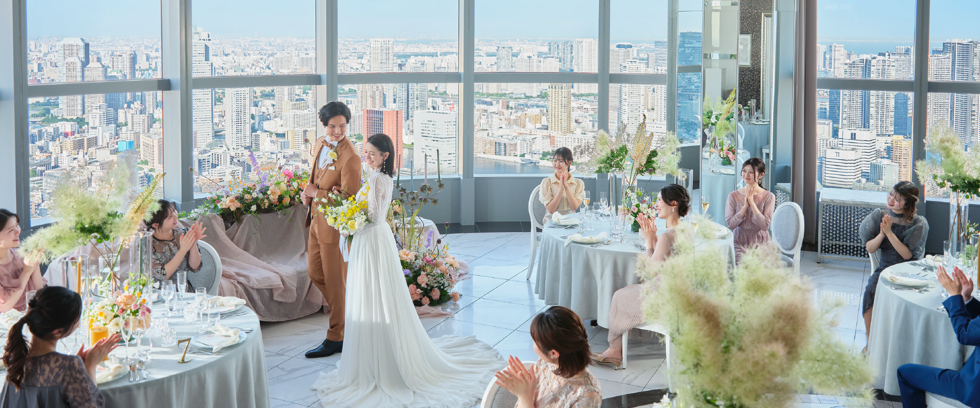 空間を演出するためのアクセサリー大きな窓に囲われた披露宴会場の